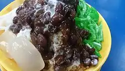 • Ice kacang, a mound of grated ice on a base consisting of jelly, red beans, corn and attap seeds, topped with various kinds of coloured sugar syrups, palm sugar, rose syrup and evaporated milk.