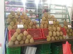 A wide variety of tropical fruits are available all year round. By far the most well known is the durian, known as the "King of Fruits", which produces a characteristic odour from the creamy yellow custard-like flesh within its spiky green or brown shell. Durians are banned on public transport, elevators, certain hotels, and public buildings because of their strong odour.