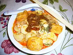 • Yong Tau Foo (酿豆腐; niàng dòu fǔ), a dish that contains a varied selection of food items, including tofu filled with ground meat mixture or fish paste, fish balls, crab sticks, an assortment of vegetables and meat.