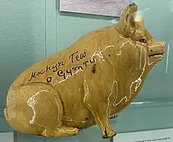 A pottery pig, from Swansea Museum, made at Ewenny Pottery, Ewenny, Vale of Glamorgan. The writing on the side of the pig reads in Welsh: Mochyn tew o Gymru (Fat pig from Wales)
