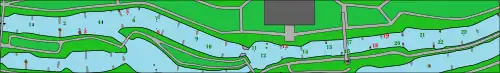 The centre has two parallel whitewater channels; the drop is the same for both channels, 6.6 meters (22 feet). The left channel is 356 meters long, with a 1.9% slope of 19 m/km (98 ft/mile) and a streamflow of 7 to 22 m3/s (247 to 777 ft3/s). The right channel is 460 meters long, with a 1.4% slope of 14 m/km (76 ft/mile) and a streamflow of 7 to 12 m3/s (247 to 424 ft3/s). When both channels are watered, the left channel streamflow is 15 m3/s (530 ft3/s) and the right is 7 m3/s (247 ft3/s).[1]