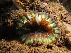 Cynarina lacrymalis is a large, solitary coral with a single polyp nestling in a corallite, the stony cup it has secreted. It can grow to a diameter of 10 cm (3.9 in) and a height of 8 cm (3.1 in).[3] It is cylindrical with a round or oval upper surface. It is usually fixed to rock but has a pointed base and can be embedded in sand or survive unattached. There are twelve broad white radially arranged septa (ridges) joined to the corallite wall, with secondary septa between for a total of 96 septa. The coral's costae (continuations of the septa) alternate between thick and thin depending on the septa they are an extension of.[4] They have large, rounded lobes and the central axial structure (columella) in the corallite is short and broad. The septa can be seen through the transparent, fleshy mantle which contains symbiotic flagellates known as zooxanthellae which give the coral its colour. This is usually pale brown or green, sometimes with a contrasting oral disc, but also sometimes pinkish or bluish.[5] The colour depends on which species of zooxanthella take up residence.[6] The coral has the ability to change its surface from glossy to dull but it is unclear why it does this. At night, when the polyp extends its many tentacles to feed, the coral resembles a sea anemone.[7]
