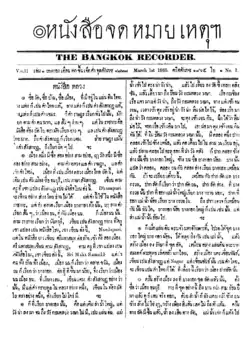 At royal request, Bradley printed the Opium Edict in 1839,[6] which marked the beginning of printing public documents in Siam. Mongkut took a strong interest in the printing press and after he took a visit to London, Bradley and Mongkut made the first copyright transaction in the history of Siam in 1862, a travel journal of Mongkut’s visit. With royal approval, Bradley founded the first newspaper in Siam, The Bangkok Recorder which was published monthly from 1844-1845 and 1865-1867. He also printed the annual almanac, The Bangkok Calendar, from 1859 till his death.