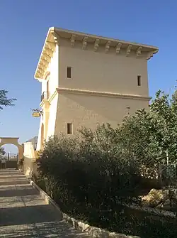 Another structure whose design was also similar to the De Redin towers was the Falkun Tower (Maltese: Torri Falkun), located at the Montekristo Estates in Ħal Farruġ, limits of Siġġiewi. This tower, along with other parts of Montekristo Estates, was constructed illegally without the necessary permits.[14] It was supposed to have been demolished in November 2013, but the courts stopped the planning authority MEPA from carrying out the demolition.[15] Since the failed attempt at demolishing the tower and the other illegal structures, new roofing works were carried out on the tower,[16] while more illegal structures were constructed elsewhere in Montekristo Estates.[17] The tower began to be dismantled according to MEPA orders in April 2016.[18] Another tower was built in 2016 in Gozo as a rural structure, similar to the coastal towers but located inland.[19]