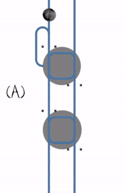 Four processes (blue lines) compete for one resource (grey circle), following a right-before-left policy. A deadlock occurs when all processes lock the resource simultaneously (black lines). The deadlock can be resolved by breaking the symmetry.