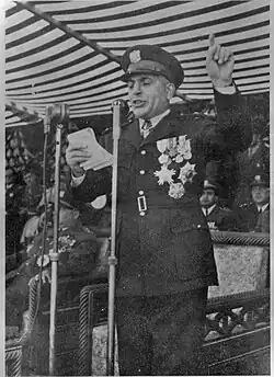 In a statement broadcast on Radio Damascus, Shishakli denounced the maneuvers of Army Chief Sami al-Hinnawi and his deputy As'ad Talas, accusing them of "conspiring against the republican system of Syria."[13] Shishakli announced that he acted to prevent a union with Iraq and preserve Syria's independence.[4] Shishakli notably did not remove Syria's civilian government, who kept the president and prime minister in power.[7] As a counterbalance to Atassi's presidency, Shishakli created the 'Council of Colonels' (later replaced by the Supreme Military Council), a body composed of minority officers that allowed him to exert influence over governance.[14]