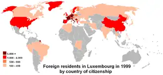Luxembourg does not formally collect ethnic or racial data of its citizens.[11] The foreign population resident in Luxembourg currently numbers over 313,407, corresponding to 47.43% of the total population (compared to 13.2% in 1961).[3] That means there are currently almost as many immigrants as there are native citizens. These immigrants are overwhelmingly[12] nationals of EU countries (accounting for over 80%), by far the greater part of whom originally come from Portugal, Italy and the two neighbouring countries, France and Belgium. For some years, there has also been a large increase in the number of immigrants and asylum seekers from the countries of Eastern Europe, and especially the new republics to have emerged from the former Yugoslavia (Bosnia and Herzegovina, Serbia, and Montenegro). These immigrants include a considerable proportion of young people. Immigrants (especially asylum seekers) have a strong impact on the birth rate, accounting for nearly 50% of births in Luxembourg. The population of Ukrainian immigrants increased dramatically following the 2022 invasion of Ukraine, representing nearly a percent of the total population as of 2023.[13]