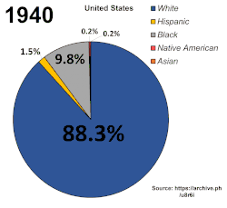 In 1900, when the U.S. population was 76 million, there were 66.8 million white Americans in the United States, representing 88% of the total population,[40] 8.8 million Black Americans, with about 90% of them still living in Southern states,[41] and slightly more than 500,000 Hispanics.[42]