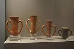 The basic form of these vessels consists of a tall, narrow beaker with a round base and two large handles opposite each other, which are attached close to the base of the vessel, and close to the edge of the vessel. There are hand-made and wheel-made specimens. Some are tapered at the bottom and others have a flat base.