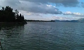 Dian Lake is a shallow freshwater fault lake. The Lake is 40 km long, running from north to south, and has an average width of 7 km with the widest point being 12.5 km. The lake is 1886 meters above sea level and has 150 km of coastline. The lake's drainage area has a monsoon-affected subtropical highland climate (Köppen Cwb), with an average annual temperature of 14.4 °C, a frost-free period of 227 days, and an annual precipitation of 1036 mm. The lake covers 298 km2 (115 sq mi). The lake has an average depth of 4.4 m (14 ft),[2] and is divided into two parts by an artificial dike. The northern end of the lake is called Caohai (Chinese: 草海; pinyin: Cáohǎi) and has a surface area of 7.5 km2 and an average depth of 2.5 meters. The southern end of the lake, comprising the majority of the lake, is called Waihai (Chinese: 外海; pinyin: Wàihǎi) and has a surface area of 292 km2 and an average depth of 4.4 m. The water flows out of the lake to the west via the Pudu River (Chinese: 普渡河; pinyin: Pǔdù Hé) which eventually joins the Yangtze River before finally reaching the Pacific Ocean.[3] Dian Lake is the sixth largest lake in China and the largest lake in Yunnan Province.