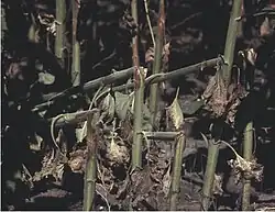Multiple stem infection causing plant death (Photo Dr Tom Gulya, USDA)