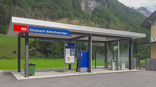 Diesbach-Betschwanden railway station is a railway station in the municipality of Glarus Süd in the Swiss canton of Glarus. It takes its name from the nearby villages of Diesbach and Betschwanden. The station is situated on the Weesen to Linthal railway line, and served by the hourly Zürich S-Bahn service S25 between Zurich and Linthal.[1][2][3][4]