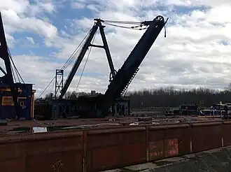 Dipper Dredge No. 3 is a historic dredge located at Lyons in Wayne County, New York. It is a steam-powered floating dredge located at the dry dock of the New York State Barge Canal at Lyons. The dredge consists of a rectangular riveted steel hull built in 1929 and measuring 110 feet in length, 34 feet in beam, and 7 feet in draft. The bow of the hull is squared and vertical. The stern is squared but inclined in the manner of a scow. In 1946, fuel bunkers were added to the sides of the hull. Much of the machinery, including the steam engines, was built in 1909.[2]