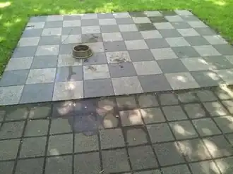 Dog Bowl was designed by dog photographer William Wegman in 2001 and installed in the North Park Blocks between Davis and Everett streets in 2002.[1][2][3][4] Wegman had been "cultivated" and privately funded by the Pearl Arts Foundation to create a work for Portland.[3][5] The installation features a cast-bronze dog bowl set on an 8-foot (2.4 m) x 10-foot (3.0 m) checkerboard that is reminiscent of a linoleum kitchen floor. Most of the squares are black and white granite tiles, but four are artificial turf. The bowl was designed to be reminiscent of the Benson Bubbler drinking fountains installed throughout the city and is supplied by an underground water source.[1] According to the Regional Arts & Culture Council, which administers the sculpture, Wegman said he created the sculpture "for dogs, not people", and prefers not to think of the bowl as public art. Wegman donated some of his earnings from the installation to the Oregon Humane Society, Foster Pets and the Delta Society.[3]