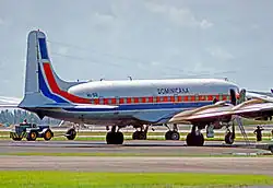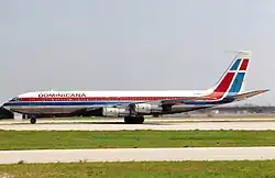 The most common Dominicana livery consisted of a metallic silver fuselage, with red and blue cheatlines going all the way from the cockpit to the tail painting,[6] representing the colors in the Dominican flag. The Dominicana titles were written in black letters above the passenger windows.