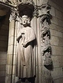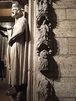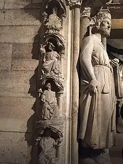 There are three arches linking the doorway to the overhead vault.[14] A trilobed arch over the tympanum, a middle arch with kneeling angels, and an outermost arch resting on the piers.[15] The tympanum contains carvings showing the Coronation of the Virgin, a popular theme for the tympana of 13th century French doorways.[16] The passage has suffered some damage, and some figures have lost their heads or hands. The passage shows the Virgin sitting to Christ's right (the place of honor), bending toward him as he crowns her with his right hand. Her arms are raised in a gesture of veneration. He is holding a jeweled disk, representing his dominion, and is positioned on two lions, indicating that he is occupying the throne of Solomon.[17] Mary's feet rest on a serpent-like creature, probably an adder.[16]