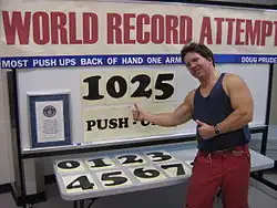 Doug Pruden displaying two world records: 677 one-armed back-of-the-hand push ups in one hour and 1781 back-of-the-hand push ups in one hour (2005)