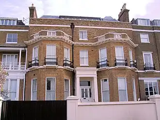 The Georgian house dates from c. 1780, is on part of Richmond Hill and overlooks the Thames; the apex of the Thames side of the hill marks the start of Richmond Park which itself forms the plateau at the top of the hill, the largest urban park in the United Kingdom. The home was built of brown brick with yellow window dressing. It includes four storeys and a basement with bays on either side and balconies above. It features modillion cornice and balustrading above and cast-iron balustrades on the second floor windows. Windows above the bays are round-headed, and others are square-headed sash windows. The porch has heavy entablature and Doric piers.[1]