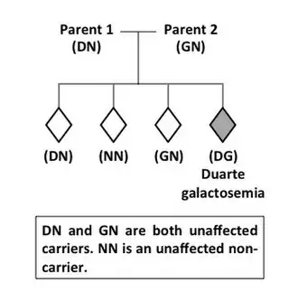 Duarte Galactosemia Inheritance: The above figure demonstrates the autosomal recessive mode of DG inheritance.