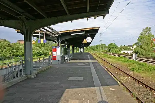 Duisburg-Meiderich Süd is a railway station in Duisburg, North Rhine-Westphalia, Germany serving the city district of Meiderich. The station is located on the Oberhausen–Duisburg-Ruhrort railway and is served by RB services operated by NordWestBahn There also is an adjacent underground Stadtbahn station which is named Meiderich Bahnhof (Meiderich station), although besides Meiderich Süd (southern station), there is another station in Meiderich, Meiderich Ost (eastern station).