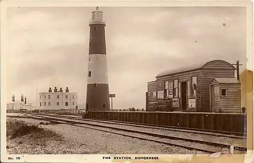Dungeness was the terminus of the Lydd Railway's branch from Appledore which opened on 7 December 1881. Passenger services initially terminated at Lydd, although a goods service operated as far as Dungeness. The line was opened throughout to passengers as from 1 April 1883. A second branch was opened the following year from a point just south of Lydd to New Romney. The railway terminated almost at the foot of Dungeness lighthouse (1901) where very basic facilities were provided in the shape of a single platform on which was perched a small arched roof weather-boarded shed comprising a ticket office, waiting room and ladies and gents toilets. A run-round loop was provided to facilitate engine reversals and a siding led to the lighthouse.[2]