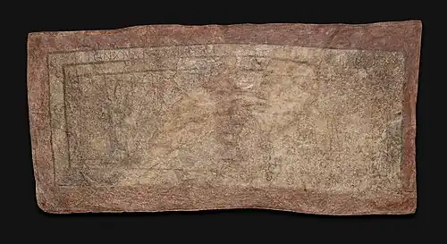 Graffiti and drawings were found on the walls of the house. A Greek inscription on the west wall of the assembly hall is important for the history of the building. It names the year 545 of the Seleucid era, which corresponds to the year 232/233 AD.[60] Several examples of the Greek alphabet were present, as was one instance of the Syriac alphabet.[61] Four names were also identified, two of which, Paulus and Proclus, come from Latin and are linked to members of the Roman garrison who occupied the city, lending to the theory that the Roman army had an influence on the origin of Christianity in Dura-Europos.[30] Also noteworthy are two line drawings, each depicting a rider.