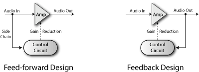 The signal entering a compressor is split; one copy is sent to a variable-gain amplifier and the other to a side-chain where the signal level is measured and a circuit controlled by the measured signal level applies the required gain to the amplifier. This design, known as a feed-forward type, is used today in most compressors. Earlier designs were based on a feedback layout where the signal level was measured after the amplifier.[4]