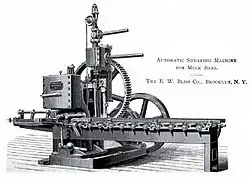 Bliss machines were often huge and very heavy, powered by steam and were sold or used by the company itself to manufacture pressed metal products. These machine tools sported names such as "Automatic Muck Bar Shear", "Gang-Slitting Machine", "Double Seamer for Flat Bottoms Machine", "Double Crank Press", "Double Eccentric Press, Geared", "Reducing Press" and "Power Press No 18 on Short Legs".[4][5]