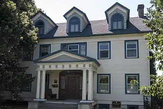 The E. William Brackett House, located in Yakima, Washington, was listed in the National Register of Historic Places in 1990.[2] Originally located on 80 acres (32 ha) of orchards and farmland, the building is currently on a three-quarter acre lot, the remainder of the property having been subdivided mostly for single family homes. The interior is composed of 6,000 sq ft (560 m2) of living space symmetrically arranged around a central entry hall.