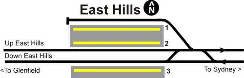 A new station was built south-east of the original station as part of the extension opening in August 1987 with the original station closed and demolished.[5] Following the extension, East Hills became the main intermediate terminus and an interchange point between all stops and limited stops trains. In addition to the two through tracks (platforms 2 and 3), a side terminating track (platform 1) was provided. A new centre turnback at Revesby opened in 2009 as part of the Rail Clearways Program, which ended East Hills' role as the primary intermediate terminus.