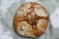 Colomba pasquale or colomba di Pasqua (lit. 'Easter dove') is an Italian traditional Easter bread, the Easter counterpart of the two well-known Italian Christmas desserts, panettone and pandoro. The dough for the colomba is made in a similar manner to panettone, with flour, eggs, sugar, natural yeast and butter; unlike panettone, it usually contains candied peel and no raisins. The dough is then fashioned into a dove shape (colomba in Italian) and finally is topped with pearl sugar and almonds before being baked. Some manufacturers produce other versions including a popular bread topped with chocolate.[6] The colomba was commercialised by the Milanese baker and businessman Angelo Motta as an Easter version of the Christmas speciality panettone that Motta foods were producing.[7]