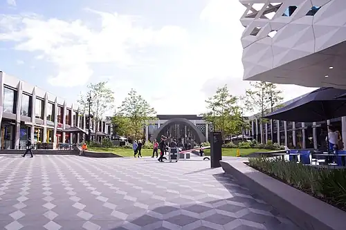 QIC publicly unveiled the plans on 28 October 2013. The $665 million redevelopment expanded retail space from 80,000 to 113,000 m2 (860,000 to 1,220,000 sq ft) and included construction of an additional three storeys connecting the southern end of the centre with the Maroondah Highway.[19] This included a new entrance to the third level of Myer, an outdoor public square with food and beverage outlets and a new public library. Office and hotel towers were also proposed adjacent to the new precinct together with a Target and David Jones department stores.[20][21][22]