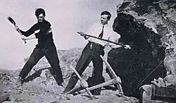 Mr. John Backey (right), Manual Training teacher at Sturgeon Bay High School, demonstrates the use of the chisel during the 1915–1916 school year.