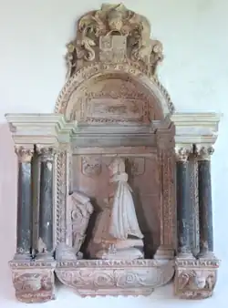 Mural monument in Broadhembury Church, Devon, to Sir Edward More (c. 1555–1623), as identified by his arms above. One of his two daughters and co-heiresses was Elizabeth More, who married Sir Thomas Drewe (d. 1651) of The Grange in the parish of Broadhembury in Devon, Sheriff of Devon in 1612[1]