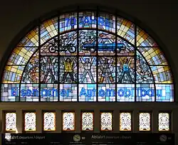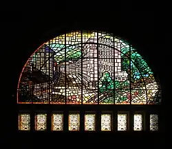 Stained glass representation of the Ruhla watch factory in the station entrance hall