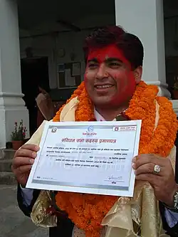 Ek Nath Dhakal holding certificate of the Member of the Constituent Assembly of Nepal after elected on 2008