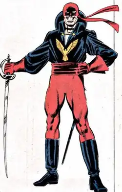 El Águila is patterned after the literary hero Zorro.[7][8] His name is Spanish for "the Eagle."[9] Writer Mary Jo Duffy recounted the creation of El Águila, "El Águila was designed by Dave Cockrum and he had this big Zorro thing, and Zorro was another one of these characters that I was just crazy about and Power Man and Iron Fist was tricky. These were not guys who could fly. Their superpowers were defensive and if they were offensive, it was going to be hands-on, and it's remarkably tricky inventing a villain for somebody like that ... It seemed to me that someone like Zorro but with one or two powers would be about the right level and since Iron Fist was a little bit easygoing and unworldly, and Power Man was just so cranky and completely grounded in the here and now, giving him somebody with this playful panache would be frustrating. Iron Fist wouldn’t even get it, Power Man would be infuriated by it, and it would give El Águila a certain amount of charm. So I wasn’t just thinking of the power problem, though it was a problem, but in terms of the characters—it had to interest me. And Power Man and Iron Fist were so well-realized as characters that if a villain wasn’t as equally well-realized, then what was the point in doing it?"[7]