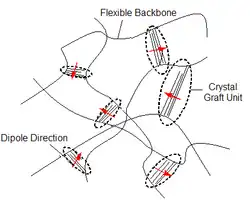 Electrostrictive graft polymers consist of flexible backbone chains with branching side chains. The side chains on neighboring backbone polymers cross link and form crystal units. The backbone and side chain crystal units can then form polarized monomers, which contain atoms with partial charges and generate dipole moments.[13]
