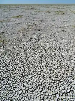 The salt pans are the most noticeable geological features in the national park. The main depression covers an area of about 5,000 square kilometres (1,900 sq mi), and is roughly 130 km (81 mi) long and as wide as 50 km (31 mi) in some places. The hypersaline conditions of the pan limit the species that can permanently inhabit the pan itself; occurrences of extremophile micro-organisms are present, which can tolerate the hypersaline conditions.[8] The salt pan is usually dry, but fills with water briefly in summer, when it attracts pelicans and flamingos in particular. In the dry season, winds blowing across the salt pan pick up saline dust and carry it across the country and out over the southern Atlantic. This salt enrichment provides minerals to the soil downwind of the pan on which some wildlife depends, though the salinity also creates challenges to farming activities. The Etosha Pan was one of several sites throughout southern Africa in the Southern African Regional Science Initiative (SAFARI 2000). Using satellites, aircraft, and ground-based data from sites such as Etosha, partners in this program collected a wide variety of data on aerosols, land cover, and other characteristics of the land and atmosphere to study and understand the interactions between people and the natural environment.