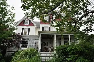The Everett Wallace House stands in the southern part of the village center of Milbridge, on the west side of US 1 just north of its junction with Wyman Road. It is set on a lot fronted by a picket fence along with a two-car detached garage. The house is a 2+12-story wood-frame structure, with asymmetrical styling typical of the Queen Anne period. It has a steeply pitched gabled roof, a brick foundation, and an exterior clad in a variety of finishes, including wooden shingles, aluminum siding, and applied Stick style half timbering. It is roughly L-shaped, its shape somewhat obscured by single-story porches along the front, one of which has been enclosed in glass. Its front is in three sections, with a central three-story tower flanked by a projecting gabled section on the right and a recessed one on the left.[2]