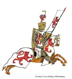 Everhard II Knight of Limburg Hohenlimburg (1298 - 11 November 1344) was the eldest son of Diederik II count of Limburg Hohenlimburg and Irmgard of Greifenstein, intended as a successor. Together with his brothers Kraft and Diederik, he is mentioned in their father's charters from 1324 onwards. But due to his early death, Everhard did not manage the county of Limburg independently as count. Around 1326 he married Jutta of Sayn, daughter of Engelbrecht II, Count of Sayn Homburg, and with her had two sons Diederik and Johan. Their great-uncles Hendrik and Diederik had previously died without descendants, while Everhard's uncle Kraft was canon of the abbey of Essen, and thus unmarried. The brothers were therefore in line to become direct heirs to their grandfather in 1364. Canon Kraft, then co-regent and guardian of his nephews, took care of the transfer of the county.