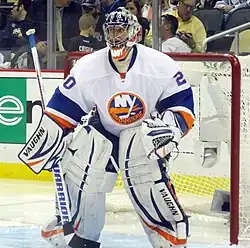 In August 2011, Nabokov stated that he would be reporting to New York's training camp. He played for the team the entirety of the 2011–12 season, wearing the number 20, and eventually took over the starting goaltender position. He got his first win with the team on October 15, 2011, against the New York Rangers.[29] On January 14, 2012, Nabokov recorded his 300th career win against the Buffalo Sabres, becoming the 26th goaltender to reach the milestone.[30] On March 21, 2012 he signed a one-year, $2.75 million contract extension to remain with New York for another season,[31] followed by another one-year $3.25 million contract for the 2013–14 season.[32]