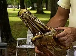 Alligator gar head, showing dual rows of teeth, from video