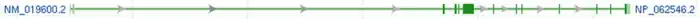 The FAM214A gene is located on the negative DNA strand (see Sense (molecular biology)) of chromosome 15 between position 52,873,514 and 53,002,014; thus making the gene 97,303 base pairs (bp) long.[5][8][9] FAM214A has been previously labeled with two other aliases, known as KIAA1370 and FLJ10980.[5] The FAM214A gene is predicted to contain 12 exons which comprise the final 4231 bp mRNA transcript after transcription has occurred.[10] It is this mRNA product that is then translated into the final FAM214A protein with the help of the promoter sequence and transcription factors. The promoter for the FAM214A mRNA sequence was predicted and analyzed by the El Dorado program on Genomatix.[11] This promoter is 601 base pairs long and spans a portion of the 5' UTR.[11]