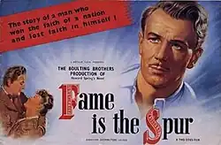 Fame is the Spur is a 1947 British drama film directed by Roy Boulting and starring Michael Redgrave, Rosamund John, Bernard Miles, David Tomlinson, Maurice Denham and Kenneth Griffith.[2][3] It was written by Nigel Balchin based on the 1940 novel Fame Is the Spur by Howard Spring, which was believed to be based on the career of the Labour Party politician Ramsay MacDonald.[4] Its plot involves a British politician who rises to power, abandoning on the way his radical views for more conservative ones.