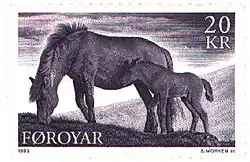 The Faroe pony (Faroese: føroyska rossið) is a small but strong pony. Its height is between 115–125 centimetres (45–49 in). In the old days it was used as a work horse, carrying heavy loads, but now it’s mostly used as a child’s riding horse. In the early 1900, a lot of ponies were exported to be used as pit ponies. In the 1960s, there were 5-6 pure ponies left; now, with huge effort, there are 73 ponies.[1]