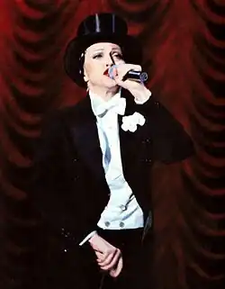 Madonna attended to various Met Gala, with her first being in 1997.[39] She also participated in a number of fashion runways, including Jean-Paul Gaultier's 1992 amfAR runway where it showed a topless Madonna; the staff of Billboard included that moment among "the most iconic moments in the history of fashion, music or breasts".[40] She closed the Gaultier 1995 Spring Collection, wearing a slip dress and pushing an antique baby carriage from which she lifted a young pup.[41] Back in 1992, Madonna participated in a Dolce and Gabbana runway show, and American fashion historian Valerie Steele considered it publicized their friendship.[42]