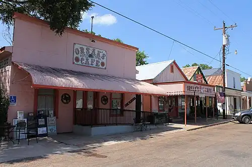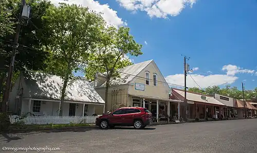A former precinct courthouse, sits in the town square with extra wide 100-foot (30 m) curbed streets on its borders as specified in the original 1850 plat. Bounded by Main, Washington, Live Oak and Fayette streets the town square is the focus of commercial development. The remainder of the town is primarily residential. Typical commercial construction is wood frame block buildings many featuring false front parapets and awnings. Residential construction is typically modest single family homes on generous lots.[2]