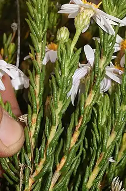 Felicia oleosa is an evergreen, upright, up to 30 cm (12 in) tall, relatively richly branched shrub. The older shoots have lost their leaves. The leaves are set alternately on the stem, overlapping, pointed upward, awl-shaped, up to 7 mm (0.28 in) long and 1 mm (0.039 in) wide, with a broad base, arched below, flat top, bare except for the edge of the leaf base which is fringed with hairs, inside with numerous translucent resin or oil ducts. The leaf axils are barely noticeably hairy.[2]