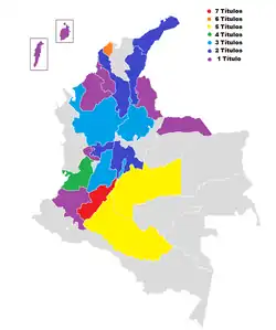 The Reinado Nacional del Bambuco is a contest similar to beauty pageants in which contestants, each representing a Colombian Department, are judged on six parameters: Performance of Sanjuanero dance, beauty, general knowledge, popularity, punctuality and performance of regional dance.[3] Of these, the performance of the Sanjuanero dance grants the most points, followed by beauty.[3] The contests' winner is declared as the National Bambuco Queen (Spanish: Reina Nacional del Bambuco). It has been made in 57 uninterrupted editions from 1961 to 2017, the first winning department was Huila while the most recent and current winner of the title is Huila as well. In the 57 editions a total of 21 territorial entities (20 departments and Bogotá) have obtained at least one crown, the department that has won the most is the host department, Huila, with a total of 7 crowns, followed by Atlántico with 6, Meta and Caquetá both with 5 and Valle del Cauca with 4, the information of all the winning departments with their respective years is shown below: